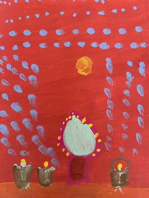 A bold red backdrop sets the stage for a surreal arrangement of glowing forms and scattered, floating marks that resemble drifting petals or sparks. At the center, a soft green oval radiates outward with small bursts of yellow, drawing attention like a quiet, pulsing light. Above it, a lone golden shape hovers, adding a sense of mystery and balance to the composition. The piece feels both dreamlike and grounded, as if capturing a moment of stillness within a vibrant, otherworldly atmosphere.