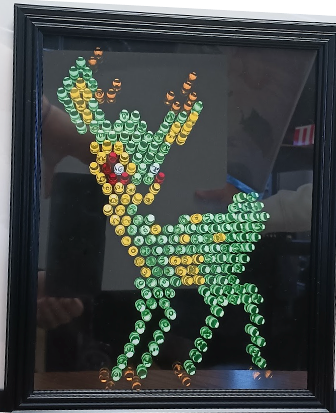 A young deer mid-prance, caught in a moment of pure, weightless joy — rendered in fresh greens, warm gold, and flashes of amber and red at its heart. The dark reflective background makes the figure appear to float, as if the fawn has leapt straight out of a forest and into another world. Spring Fawn is motion frozen in beads: restless, hopeful, and impossibly light on its feet.
